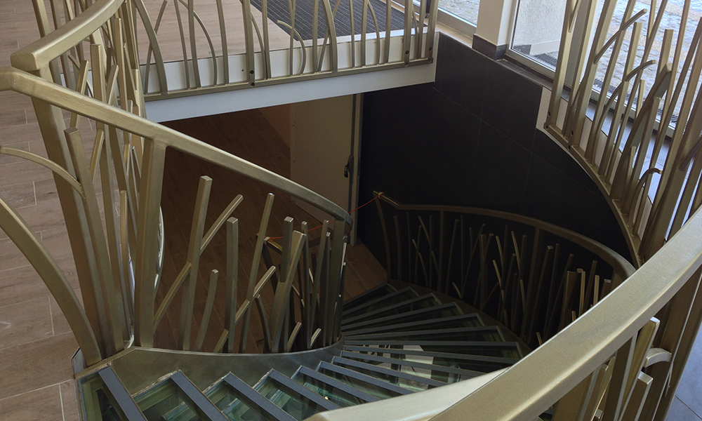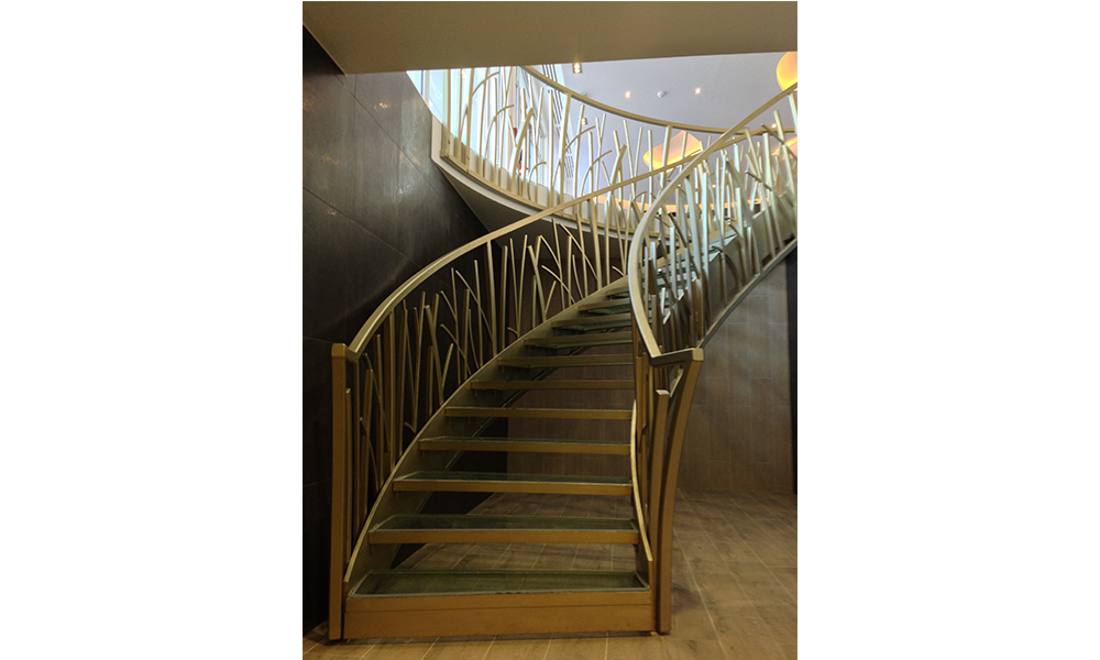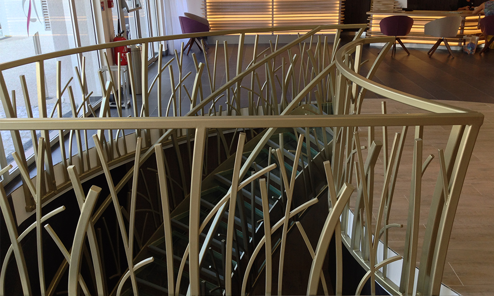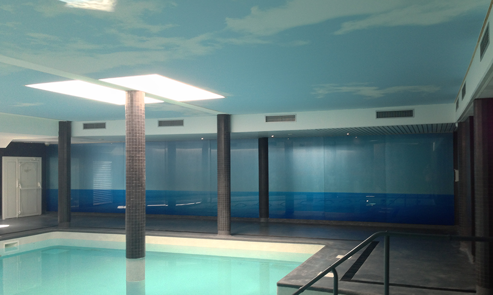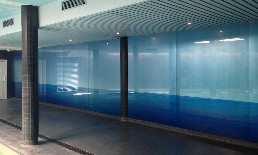 Mur de verre imprimé, feuilleté, trempé avec argenture et vinyl tendu au plafond